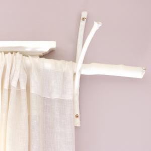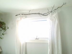 un ramo di un albero viene utilizzato come bastone per tende.Basta avvitare i rami biforcati direttamente nel rivestimento della finestra in legno o nel muro e posizionare l’asta su di esso. Assicurati di selezionare le dimensioni e il materiale adeguati in quanto devono contenere il peso tutto il giorno.